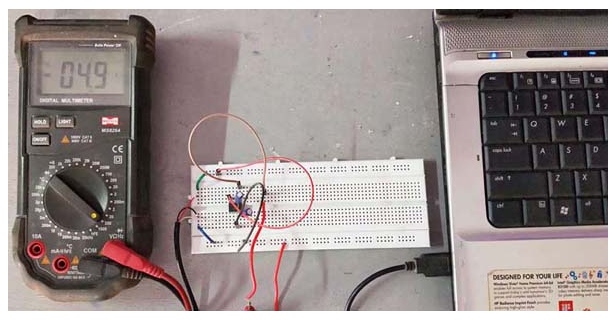 要測試電路,將USB連接到筆記本電腦或移動電源或任何USB來為電路供電。參考地用萬用表檢查J2的輸出電壓。在下面的測試視頻中,萬用表在顯示4.9V時連接到正軌。然后將萬用表連接到IC的輸出端(即ICL7660的5腳),則顯示-4.7V。