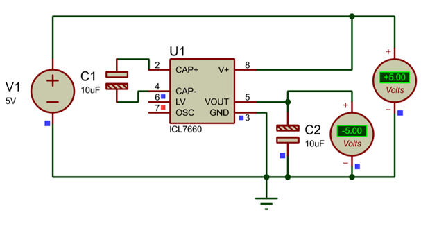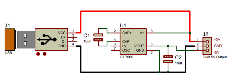 大多數模擬電子電路需要雙電源軌以實現(xiàn)適當的平衡運行;這在設計運算放大器電路時尤為重要。在A/D轉換器、運算放大器和比較器等數字系統(tǒng)中也需要負電源電壓。在所有這些情況下,電流需求將是低的,但是如果我們使用大量的分立和集成電路組件,產生這樣的-5V電源通常是昂貴和低效的。因此,在本教程中,我們將學習如何構建一個簡單的低電流雙5V電源電路,可以從我們的USB端口供電。同樣,我們之前已經構建了+12V和-12V雙電源電路。