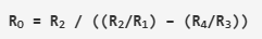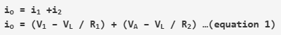 現(xiàn)在,通過應用基爾霍夫電流定律和歐姆定律,我們看到輸出電流等于輸入電流和通過電阻R4的電流之和。
