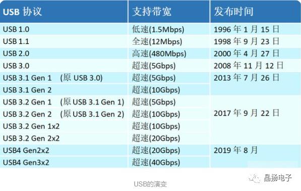 USB接口自1994年推出以來,經(jīng)過26年的發(fā)展,從USB1.0/1.1,USB2.0,USB3.x,發(fā)展到現(xiàn)在的USB4;傳輸速率從最開始的1.5Mbps,大幅提升到了最新的40Gbps