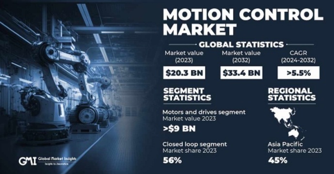 隨著工業(yè)自動化、智能制造和物聯網的發(fā)展,市場對運動控制解決方案的需求持續(xù)增長。作為驅動機械運動的關鍵技術,電機和運動控制系統(tǒng)被廣泛應用于工業(yè)自動化、機器人、消費電子、醫(yī)療設備、自動駕駛以及智能家居等多個行業(yè)。據市場調研公司GMI預測,2023年,全球運動控制市場的規(guī)模約為203億美元;市場預計在2024至2032年期間的復合年增長率(CAGR)為5.5%,2032年,市場規(guī)模預計達到334億美元。