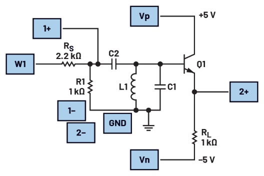 在無(wú)焊試驗(yàn)板上構(gòu)建圖2所示的電路。L1使用100 μH電感,C1和C2使用1 nF電容。此調(diào)諧放大器在諧振頻率時(shí)的峰值增益可能非常高。我們需要使用電阻分壓器RS和R1稍微衰減AWG1的輸出信號(hào)。