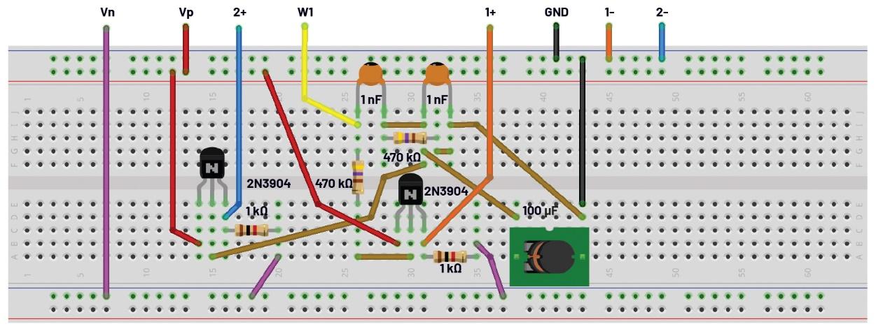 綠色區(qū)域表示連接ADALM2000模塊AWG、示波器通道和電源的位置。確保在反復(fù)檢查接線之后,再打開電源。