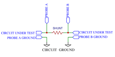 現(xiàn)在,選擇了一個(gè)電阻值,您可以將探頭地連接到電路地,探頭尖端連接到分流電阻,如下圖所示。
