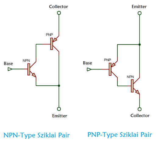 Darlington和Sziklai都有兩種類型的配置。但是,Sziklai的配置具有與普通晶體管相同的基極-發(fā)射極電壓降。而達(dá)靈頓的基極-發(fā)射極電壓降是它的兩倍。sziklai對(duì)通常用于推挽和AB類音頻放大器的輸出級(jí)。