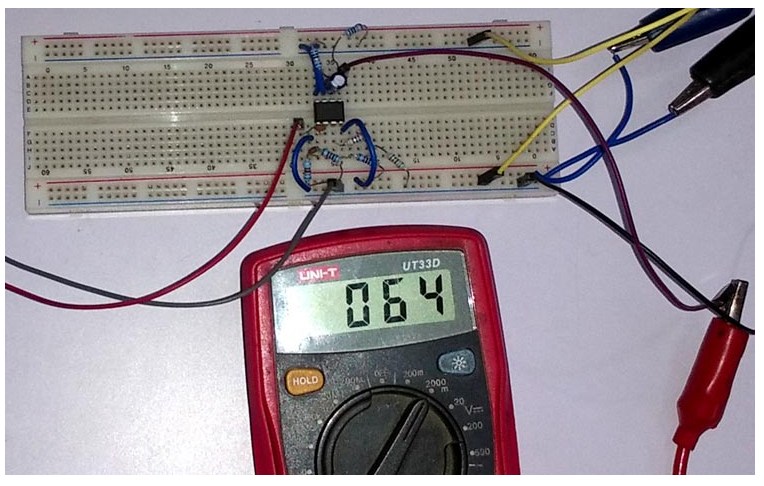萬用表的輸出顯示的是計算值。當輸入端提供500 Hz方波時,電路輸出64 mV。
