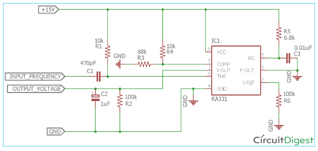 電路的主要部件是KA331。電路的輸入通過470pF電容C1連接,C1進一步連接到KA331的閾值引腳(引腳6)。電阻R3和R4形成分壓器電路,分壓器電路連接到KA331的比較器引腳7。電容C3和電阻R5是RC定時器,它在引腳5上提供所需的振蕩。電阻R2通過引腳2提供參考電流。該電路由15v電壓供電,該電壓通過KA331的引腳8連接。