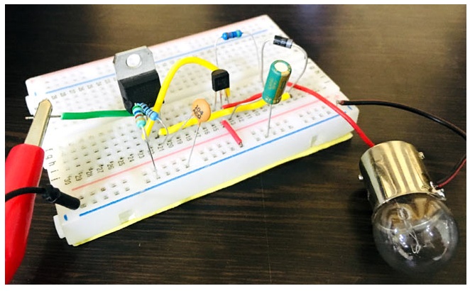 在這里,我們已經(jīng)連接了一個燈泡與軟啟動電路,慢慢發(fā)光燈泡到其全部亮度。可以通過改變電容器的值來改變燈泡的發(fā)光速率,如增加上升時間,增加電容器C2的值。
