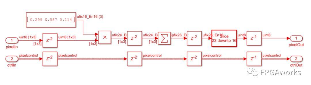 GREY=0.299*R+0.587*G+0.114*B。因此我們搭建轉(zhuǎn)換模塊如下