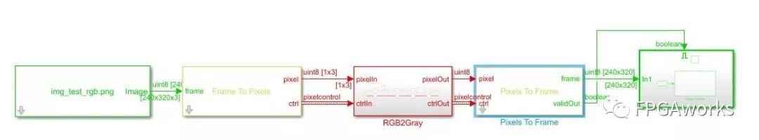 Delay模塊功能相當(dāng)于寄存器模塊,RGB信號通過pixelIn輸入,通過乘法器與對應(yīng)的常數(shù)相乘,并且使用Sum of Element模塊求和,后面的Data Type Conversion模塊截取了小數(shù)點之前的8位,也就是轉(zhuǎn)換成uint8的類型。Control Bus也要有相應(yīng)的延遲,以保證時序不變。(關(guān)于為什么使用2個寄存器延遲,以及乘法器的替代,將會在以后提到。)我們將這部分模塊封裝在一個subsystem中(選中想要封裝的模塊并點擊右鍵,選中Create Subsystem from Selection)。至此,我們的算法搭建已經(jīng)完成,如下圖。由于灰度圖像是單通道的,別忘記將Pixel To Frame中的通道數(shù)改為1。