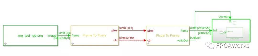 然后按照下圖連接所有模塊。此處每個模塊的輸入都包含兩個:pixel和ctrl。Pixel表示對應(yīng)的像素值,ctrl信號會indicate行開始和結(jié)束,列開始和結(jié)束,以及valid信號。不了解的同學(xué)可以參考Mathwork關(guān)于視頻接口控制總線的說明https://www.mathworks.com/help/visionhdl/ug/pixelcontrol-bus.html。