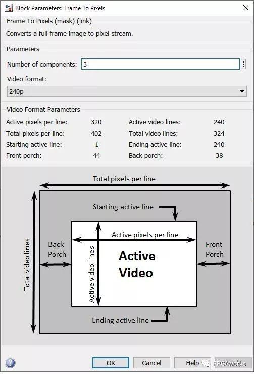 下面設(shè)置Frame To Pixels和Pixels To Frame模塊,由于我們使用的圖片格式是RGB240p,所以我們在雙擊模塊之后彈出的配置窗口里選擇Video Format為240p,RGB有3個通道,所以Number of components填3。Pixels To Frame同理。對于視頻格式不太了解的同學(xué),我建議閱讀一下Matlab的Frame To Pixels文檔的Video format部分,鏈接如下