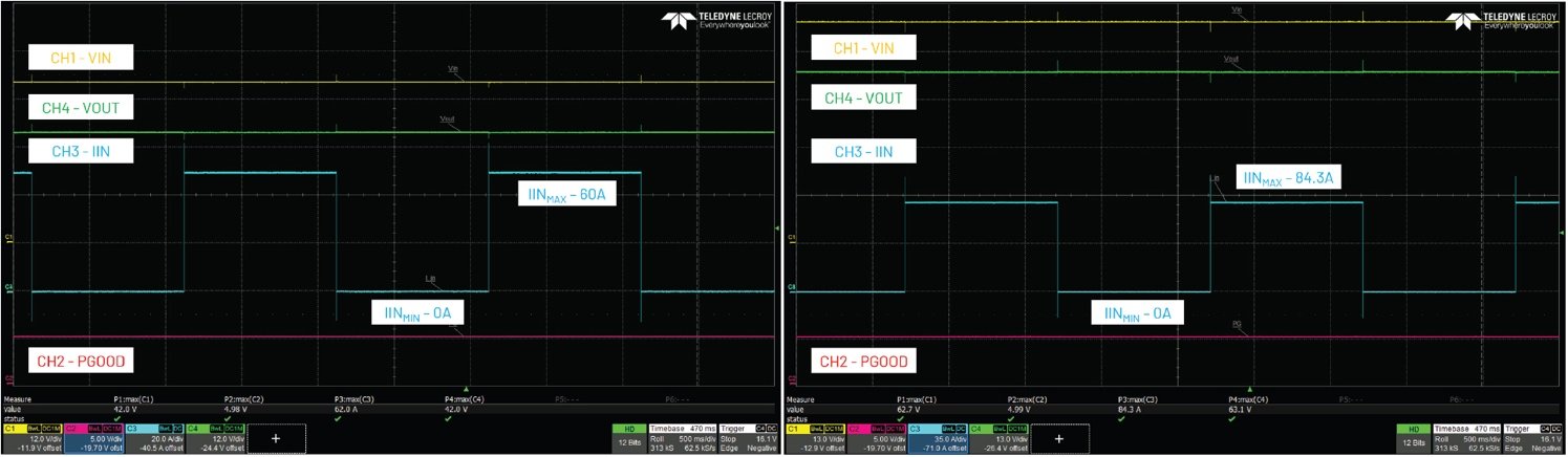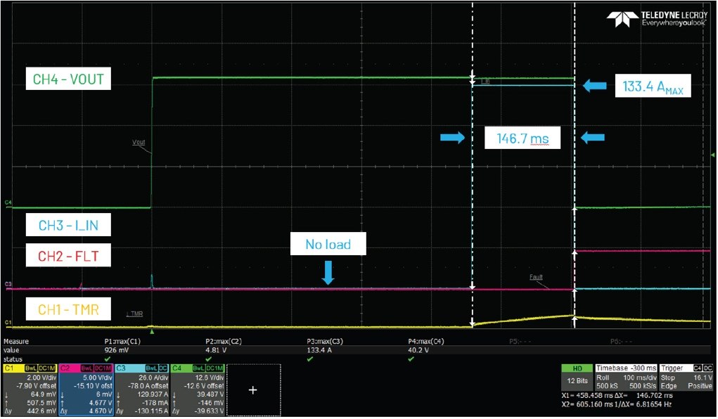 圖5.短路保護(hù)。輸入電壓為40V,負(fù)載電流為100A至130A。