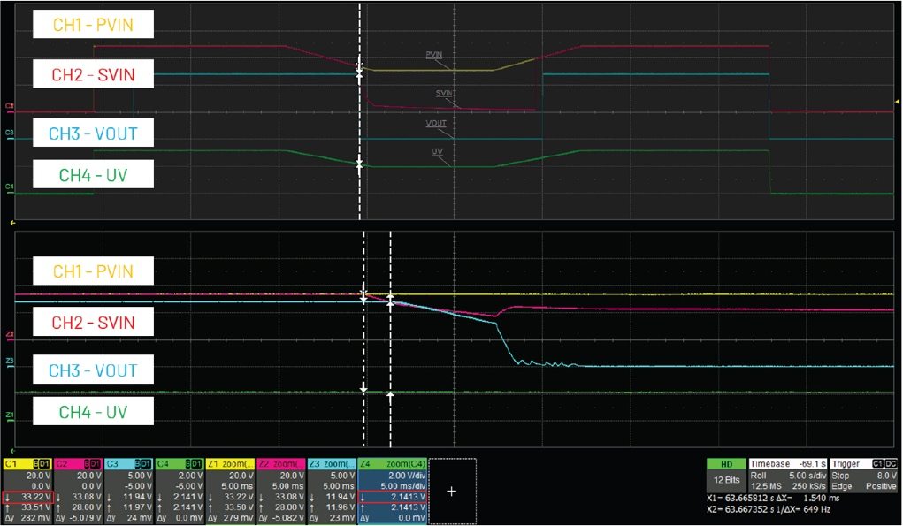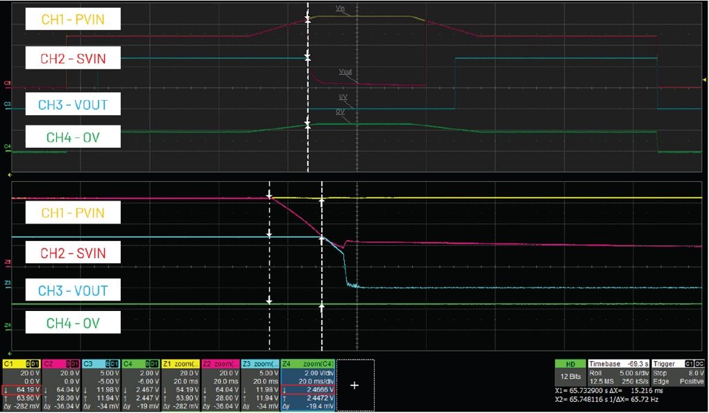圖7說明了熱插拔控制器的欠壓保護(hù)機(jī)制,當(dāng)UV引腳的電壓低于閾值(測量值為2.14 V,相當(dāng)于PVIN電壓33 V)時(shí),會(huì)使設(shè)備停止運(yùn)行。圖8則顯示了過壓保護(hù)機(jī)制,當(dāng)OV引腳的電壓超過閾值(測量值為2.47 V,對應(yīng)PVIN電壓為64 V)時(shí),會(huì)關(guān)閉設(shè)備。當(dāng)輸入電壓恢復(fù)正常時(shí),控制器會(huì)自動(dòng)重試并恢復(fù)??梢酝ㄟ^修改UV和OV引腳上的電阻分壓器值來調(diào)整閾值。