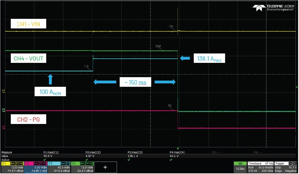 圖4.限流保護(hù),輸入電壓40V,負(fù)載電流0A至130A。
