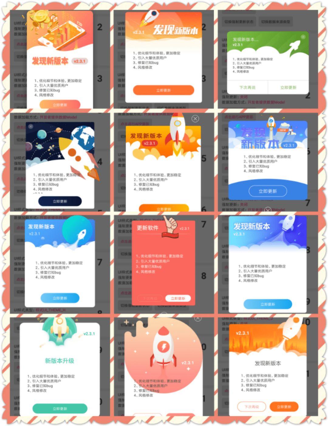 //更新庫(kù)配置UpdateConfig updateConfig = new UpdateConfig().setDebug(true)//是否是Debug模式.setBaseUrl("http://www.cretinzp.com/system/versioninfo")//當(dāng) dataSourceType 為 DATA_SOURCE_TYPE_URL 時(shí),配置此接口用于獲取更新信息.setMethodType(TypeConfig.METHOD_GET)//當(dāng) dataSourceType 為 DATA_SOURCE_TYPE_URL 時(shí),設(shè)置請(qǐng)求的方法.setDataSourceType(TypeConfig.DATA_SOURCE_TYPE_URL)//設(shè)置獲取更新信息的方式.setShowNotification(true)//配置更新的過(guò)程中是否在通知欄顯示進(jìn)度.setNotificationIconRes(R.mipmap.download_icon)//配置通知欄顯示的圖標(biāo).setUiThemeType(TypeConfig.UI_THEME_AUTO)//配置 UI 的樣式,一種有 12 種樣式可供選擇.setRequestHeaders(null)//當(dāng) dataSourceType 為 DATA_SOURCE_TYPE_URL 時(shí),設(shè)置請(qǐng)求的請(qǐng)求頭.setRequestParams(null)//當(dāng) dataSourceType 為 DATA_SOURCE_TYPE_URL 時(shí),設(shè)置請(qǐng)求的請(qǐng)求參數(shù).setCustomActivityClass(CustomActivity.class)//如果你選擇的 UI 樣式為 TypeConfig.UI_THEME_CUSTOM,那么你需要自定義一個(gè) Activity 繼承自 RootActivity 并參照 demo 實(shí)現(xiàn)功能,在此處填寫(xiě)自定義 Activity 的 class.setModelClass(new UpdateModel());AppUpdateUtils.init(this, updateConfig);