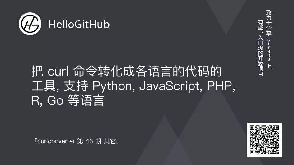 22、curlconverter:把 curl 命令轉(zhuǎn)化成各語(yǔ)言的代碼的工具,支持 Python、JavaScript、PHP、R、Go 等語(yǔ)言。