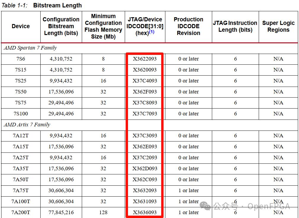 為了確保位流和FPGA芯片匹配,在讀取到同步字后還會(huì)檢測(cè)配置位流中的器件ID和目標(biāo)ID是否一致。ID是一個(gè)固定的32位的數(shù)據(jù),基于IEEE Std 1149.1標(biāo)準(zhǔn)。7系列FPGA的ID已經(jīng)在UG470 的 Table 1-1中列出,下圖是截取的一部分,其他詳見UG470。
