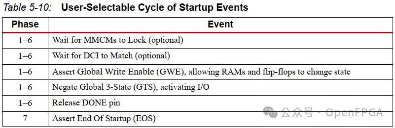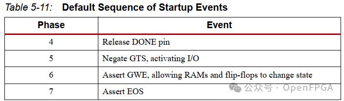 啟動(dòng)序列事件的默認(rèn)順序?yàn)橄柔尫臘ONE引腳,然后激活I(lǐng)/O,最后啟動(dòng)寫使能(詳見UG470中Table 5-11 默認(rèn)啟動(dòng)順序,下面圖12中)。實(shí)際使用中,可以通過BitGen參數(shù)對(duì)啟動(dòng)順序進(jìn)行設(shè)置來滿足不同的需求。也就是上圖中除了步驟7以外,其余幾個(gè)步驟啟動(dòng)順序是用戶可編程的,并且啟動(dòng)順序中的內(nèi)容也是可編輯的,如是否等待MMCM鎖定或者是否等待DCI阻抗匹配這些都是可配置的,以上兩個(gè)可選配置。