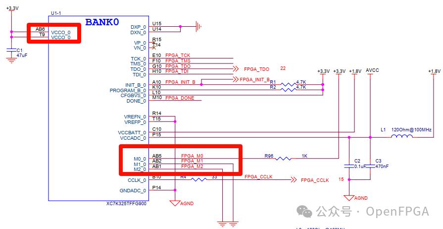 SPI FLASH配置使用BANK0和BANK14,BPI則是BANK0、BANK14和BANK15,相關(guān)的電源域如圖1所示,對(duì)于FPGA人員主要關(guān)注BANK0,下面是一個(gè)K7的典型電路: