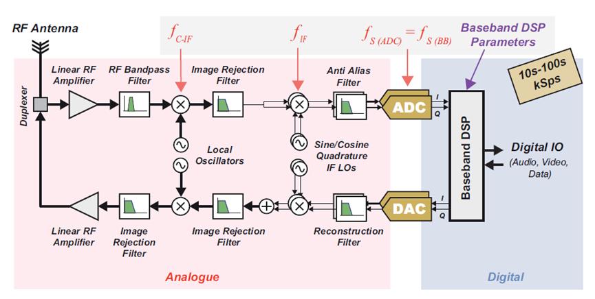 然后對基帶信號進行采樣并使用ADC進行數(shù)字化,并使用DSP操作執(zhí)行最后的處理階段以恢復傳輸?shù)男畔ⅰ?0世紀90年代的第二代移動電話——那些接收GSM信號的——很可能使用了這種架構。