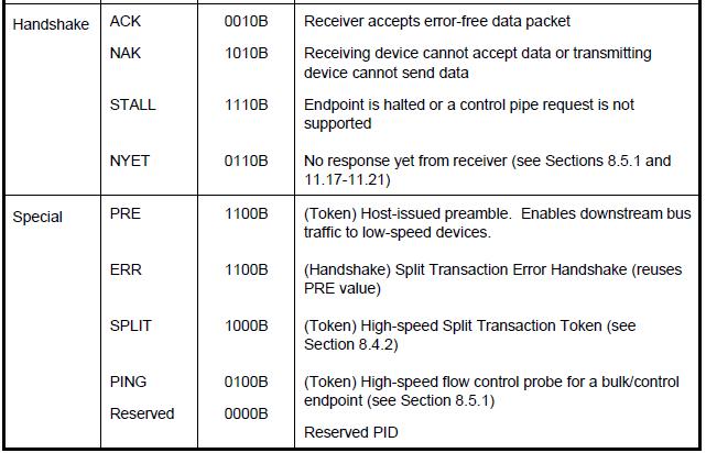 ACK: 對于IN事務,它將由host發(fā)出;對于OUT、SETUP和PING事務,它將由device發(fā)出。