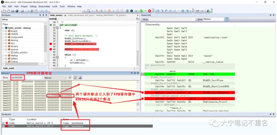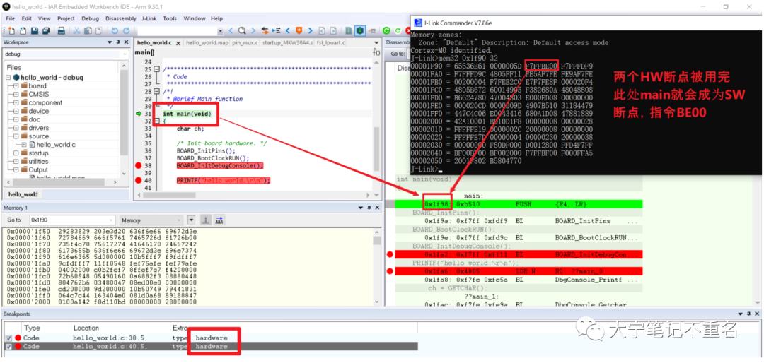 可以看到,line36,line40被強(qiáng)行設(shè)置為硬件斷點(diǎn),line38被設(shè)置為軟件斷點(diǎn),main斷點(diǎn)也自動(dòng)被分配為了軟件斷點(diǎn),對(duì)比0x1F98, 0x1F9A, 0x1FA2, 0x1FA6地址的內(nèi)容,只有0x1F98,0x1FA2兩個(gè)軟件斷點(diǎn)地址處的內(nèi)容被修改為了0xBE00,即插入BKPT指令。0x1F9A和0x1FA6兩個(gè)硬件地址的內(nèi)容沒(méi)有被修改,再次證明軟件斷點(diǎn)對(duì)于在Flash調(diào)試的控制器,本質(zhì)上就是Flash斷點(diǎn)。