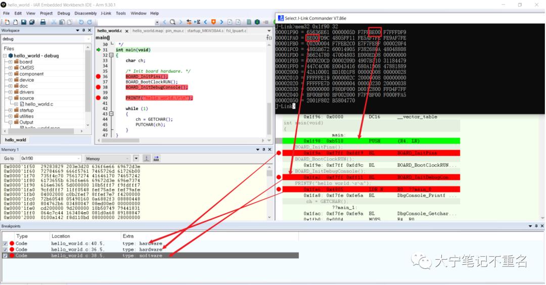 斷點(diǎn)的實(shí)現(xiàn)原理網(wǎng)上有很多介紹,大致意思都是說(shuō)在程序運(yùn)行的某個(gè)地方提前設(shè)置一個(gè)停止操作,CPU運(yùn)行到該位置之后就會(huì)自動(dòng)暫停,此時(shí)開(kāi)發(fā)者就可以查看CPU寄存器的工作狀態(tài)??蛇@里的”設(shè)置一個(gè)停止操作“是如何實(shí)現(xiàn)的呢?又意味著什么呢?網(wǎng)上找到的都是基于X86的實(shí)現(xiàn)細(xì)節(jié)介紹,針對(duì)ARM的實(shí)現(xiàn)細(xì)節(jié)找了半天也都是語(yǔ)焉不詳。發(fā)揮絕知此事要躬行的精神(客戶需要復(fù)現(xiàn)現(xiàn)場(chǎng)),筆者使用JLINK/I-JET+IAR在KW38 demo板子上做了一番測(cè)試,得出幾個(gè)很有意思的結(jié)論,完全顛覆了以前對(duì)斷點(diǎn)的一些認(rèn)識(shí),此處先拋出結(jié)論。