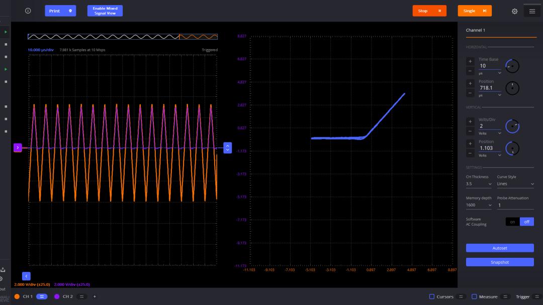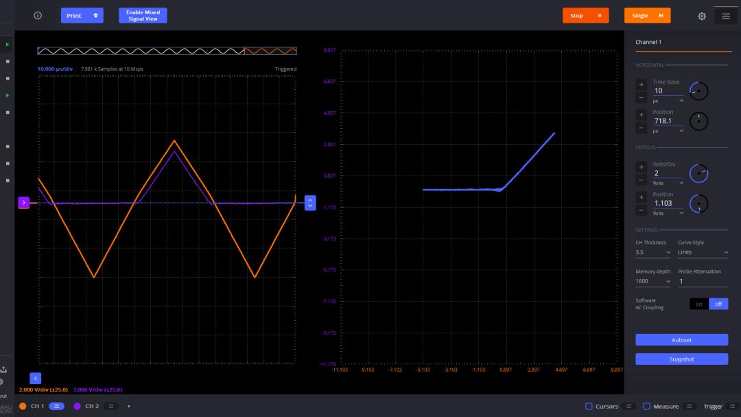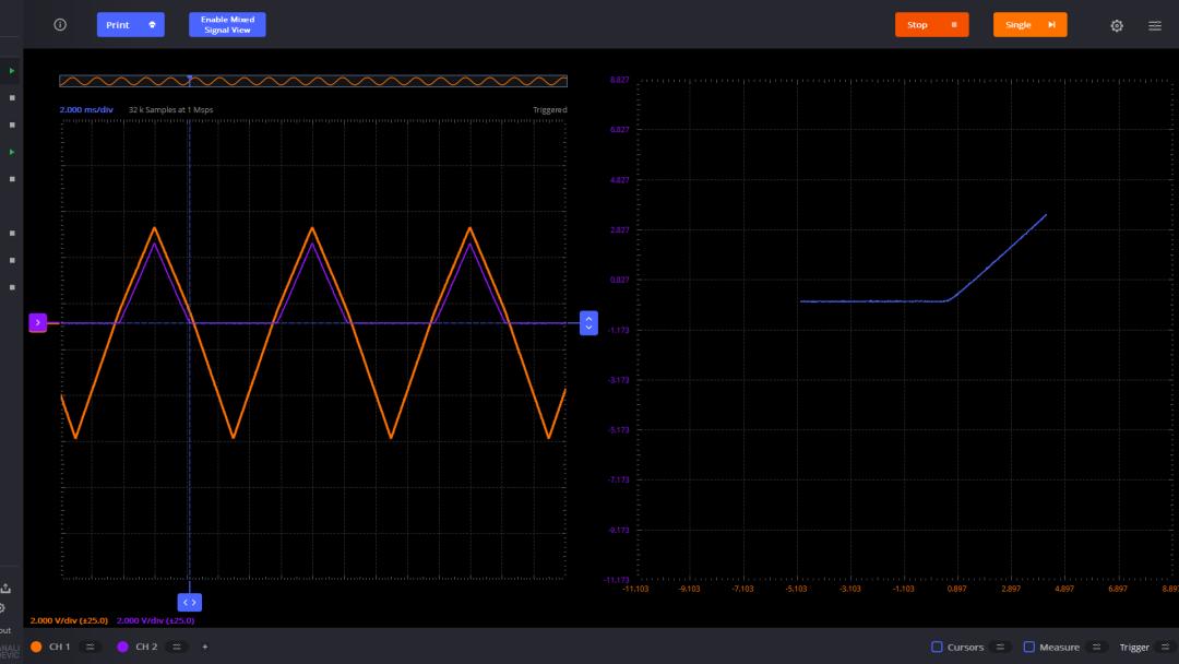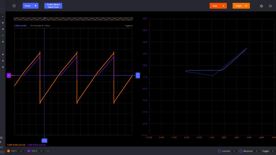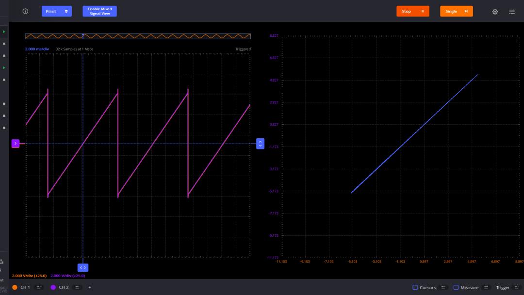 使用 ADALM2000 產(chǎn)生鋸齒波形,使用通道1 測量該信號。簡單起見,通道2 也測量該鋸齒波。它們分別作為 X-Y 電壓驅動信號。左邊顯示了兩個通道的波形。右邊這是 X-Y 對應的波形,因為它們 是同一個信號,所以對應這45°的直線。這是測量恒等系統(tǒng)的輸入輸出關系。