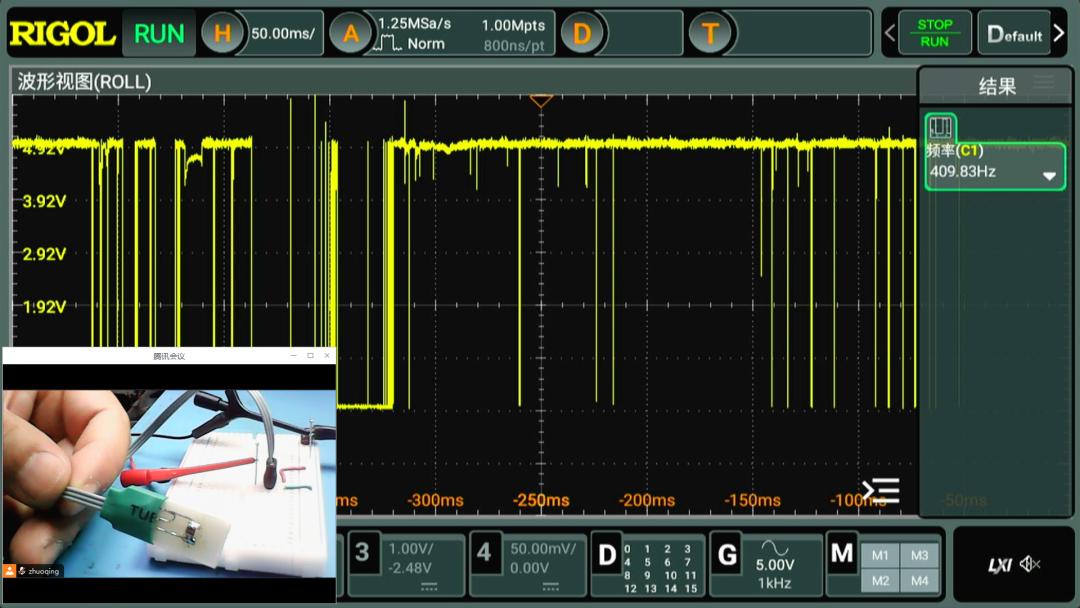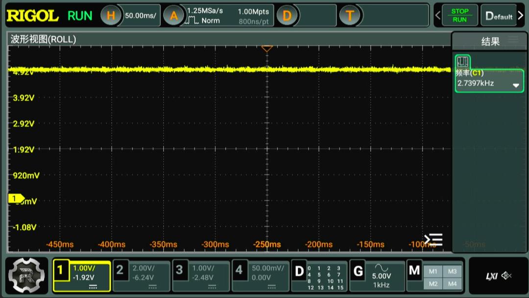 利用面包板搭建測量電路。在電阻與 C06串聯(lián)兩端接入 5V電壓。利用示波器測量 C06上的分壓電壓波形。在靜止狀態(tài)下,可以看到 C06是開路狀態(tài),分壓信號為高電平。電壓大小是電源電壓5V。