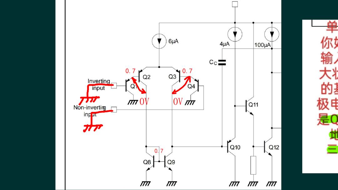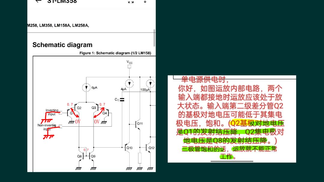 昨天,看到 B站的朋友留言,講述了他的一個(gè)疑惑。認(rèn)為這是一個(gè)至今無(wú)人能解決的問(wèn)題。? 他提到常見到的運(yùn)放 LM358,如果工作在單電源下,數(shù)據(jù)手冊(cè)上給出它的共模輸入電壓非常低,甚至可以小于0V.?那么問(wèn)題來(lái)了,假如,LM358的兩個(gè)輸入端處在 0偏置狀態(tài)。對(duì)于輸入級(jí)的差分放大電路來(lái)講,Q2、Q3的基極應(yīng)該是 0.7V。下面的電流鏡負(fù)載對(duì)地之間也是 0.7V。Q2,Q3兩個(gè)三極管,集電極 PN結(jié)的偏置電壓就是 0V。這樣一來(lái),這兩個(gè)三極管實(shí)際上處在飽和狀態(tài)。他認(rèn)為此時(shí)運(yùn)放就不能夠正常工作了呀。但實(shí)際上,LM358此時(shí)仍然具有正常放大功能。對(duì)于這樣的一個(gè)疑惑,理論上該如何應(yīng)對(duì)呢?