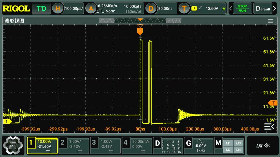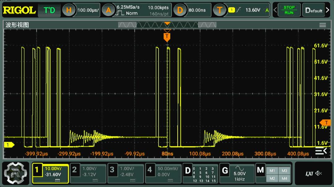 給電路輸入 60V 直流電壓,測量芯片直接輸出端口的信號波形??梢钥吹竭@是一個(gè)間歇震蕩的波形?,F(xiàn)在雖然模塊是空載,實(shí)際上電路中存在著一顆 2k 歐姆的電阻負(fù)載。
