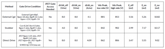 外部 C gd電容器和 RC 緩沖器方法顯示出稍高的開關(guān)損耗,但它們不需要訪問 JFET 柵極。使用分立 FET 時(shí),這兩種方法都可以在 PCB 上輕松實(shí)現(xiàn)。
