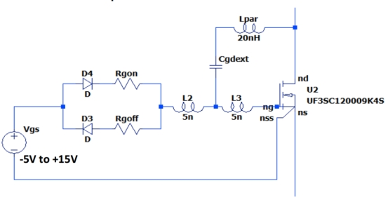 UnitedSiC 的標(biāo)準(zhǔn) FET 不提供對(duì) JFET 柵極的訪問,但采用 TO247-4L 封裝的新型雙柵極產(chǎn)品正在開發(fā)中。此方法也適用于添加了 JFET 柵極引腳的模塊。在所有情況下,SPICE 仿真都會(huì)考慮 20 nH 寄生電感,結(jié)果證明一定程度的電感不會(huì)影響 dV/dt 的降低。