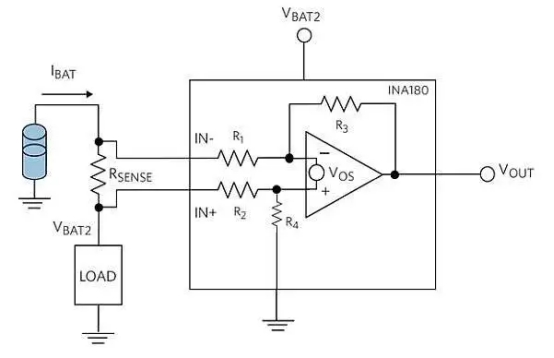 共模范圍定義了 IN+ 和 IN- 相對于地的直流電壓范圍。圖 1的 CSA設(shè)計(jì)通常支持電源以外的共模電壓。此特性允許進(jìn)行高側(cè)(靠近正電源)和低側(cè)(靠近負(fù)電源)測量。圖 1 顯示了高側(cè)測量,其中 IN+ 和 IN- 有效偏置到 V BAT1,負(fù)載電源偏置到負(fù)載電壓 V BAT2。由于 R SENSE上的壓降很小,該電路將共模電壓設(shè)置為略高于正電源。