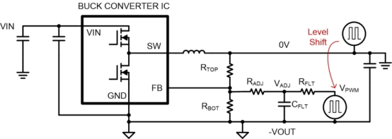 生成 V ADJ的一種簡(jiǎn)單方法是提供通過(guò)電阻電容低通濾波器的脈寬調(diào)制 (PWM) 信號(hào)。微控制器或其他數(shù)字芯片可以輸出PWM信號(hào)??刂芇WM信號(hào)的占空比將改變V ADJ。使用這種方法動(dòng)態(tài)調(diào)整反相降壓-升壓轉(zhuǎn)換器的負(fù)輸出電壓可能是一項(xiàng)艱巨的任務(wù),因?yàn)榻祲恨D(zhuǎn)換器 IC 的本地接地依賴于負(fù)輸出電壓 (-V OUT ),而不是系統(tǒng)接地 (0V)。電平轉(zhuǎn)換電路可能是必要的,就像我之前提到的 I/O 引腳的接口(圖 3)。
