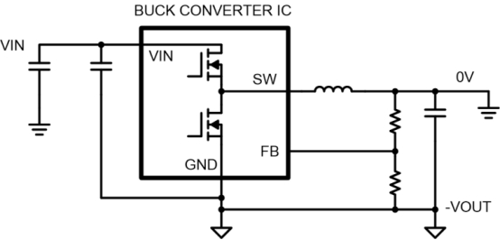 需要負(fù)輸出電壓電源的應(yīng)用包括測(cè)試和測(cè)量、航空航天和國(guó)防、汽車和醫(yī)療。創(chuàng)建負(fù)電源軌的一種常見(jiàn)方法是使用傳統(tǒng)的降壓轉(zhuǎn)換器,但將其用作反相降壓-升壓轉(zhuǎn)換器。降壓轉(zhuǎn)換器集成電路 (IC) 接地引腳連接到負(fù)輸出電壓節(jié)點(diǎn) (-V OUT ),電感器輸出連接到系統(tǒng)接地 (0V)。圖 1是一個(gè)示例配置。從輸出到反饋 (FB) 引腳的電阻分壓器設(shè)置輸出電壓。