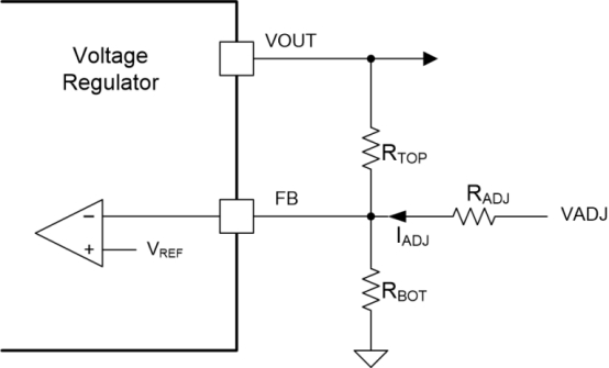 一種思考方式是,流入 FB 節(jié)點(diǎn)的拉電流(或灌電流)使其看起來(lái)頂部(或底部)電阻值已減小。電阻器的 R ADJ 的作用類似于與頂部或底部電阻器并聯(lián)的虛擬電阻器。
