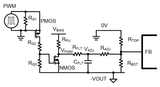 圖 4顯示了該應(yīng)用的電平轉(zhuǎn)換電路示例。該電路會(huì)將相對(duì)于系統(tǒng)接地 (0V) 的 PWM 信號(hào)轉(zhuǎn)換為相對(duì)于 IC 接地 (-V OUT ) 的 PWM 信號(hào)。 PWM 源可打開(kāi)和關(guān)閉 P 溝道金屬氧化物半導(dǎo)體場(chǎng)效應(yīng)晶體管 (MOSFET)。當(dāng) P 溝道 MOSFET 導(dǎo)通時(shí),它將 N 溝道 MOSFET 柵極拉至柵極閾值電壓以上,并導(dǎo)通 N 溝道 MOSFET。反過(guò)來(lái),這會(huì)將 V PWM拉低至 -V OUT。當(dāng)P溝道MOSFET關(guān)斷時(shí),N溝道MOSFET關(guān)斷并且電阻器R PU將V PWM拉向V BIAS。電壓偏置可以使用精密并聯(lián)穩(wěn)壓器(例如 Texas Instruments LM4040)生成,該穩(wěn)壓器通過(guò)電阻器連接到 V IN并連接到 -V OUT。如圖 3 所示,R FLT和 C FLT充當(dāng)?shù)屯V波器并創(chuàng)建 V ADJ。通過(guò)R ADJ 的電流將調(diào)節(jié)輸出電壓。