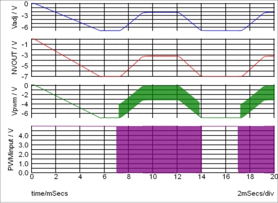 圖 5中的仿真結(jié)果顯示了該方法能夠調(diào)整負(fù)輸出電壓,其中降壓轉(zhuǎn)換器作為反相降壓-升壓轉(zhuǎn)換器運(yùn)行。在前 6 毫秒 (ms) 內(nèi),負(fù)輸出電壓(以紅色顯示并標(biāo)記為“NVOUT”)緩慢啟動(dòng)至 -7V。藍(lán)線顯示 V ADJ,它跟蹤啟動(dòng)期間的負(fù)輸出電壓。 PWM 電路在 7 ms 時(shí)啟用(PWM 輸入波形以紫色顯示)并生成電平移位 PWM (V PWM )。電壓調(diào)整(以藍(lán)色顯示)增加,轉(zhuǎn)換器輸出電壓隨之增加。經(jīng)過(guò)大約 2 ms 的轉(zhuǎn)換時(shí)間后,轉(zhuǎn)換器達(dá)到新的穩(wěn)態(tài)工作點(diǎn)(接近 -2V)。調(diào)整 PWM 信號(hào)會(huì)在仿真后期降低輸出電壓,從而獲得平滑、有效的結(jié)果。