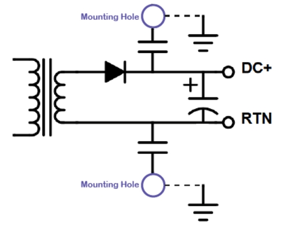 當(dāng)安裝硬件尚未用于保護(hù)接地功能時,更容易犯功能性接地錯誤。如果 PSU 沒有導(dǎo)電安裝,通常仍然需要在所有安裝孔之間建立電氣連接,因?yàn)?PSU 設(shè)計(jì)通常假設(shè)它們是連續(xù)的。轉(zhuǎn)換器次級側(cè)的一個或兩個安裝孔通常電容耦合至 DC+ 和 Return,以將 HF 噪聲分流至地,如圖4所示。