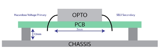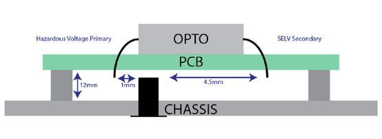 在內(nèi)部電源的安全評估中充分考慮了第 2.10 條。但是,在安裝過程中必須注意不要損害這些合規(guī)性項(xiàng)目。 PSU 靠近附近導(dǎo)體可能會降低有效爬電距離和間隙距離。考慮以下假設(shè)情況,其中光耦合器用于將輸出電壓數(shù)據(jù)傳輸?shù)焦β兽D(zhuǎn)換器初級側(cè)的控制卡。
