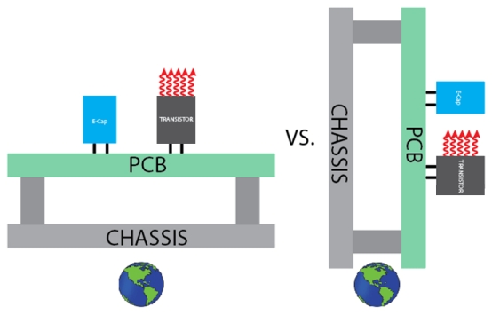 有趣的是,電源相對于地球引力的物理方向有時可能是一個重要的熱考慮因素。熱空氣從地球上升,在對流循環(huán)中被密度更大、溫度更低的空氣取代。有時,方向不當(dāng)?shù)碾娫磿偈篃峥諝饬飨蛟O(shè)計(jì)中對熱敏感的組件??紤]電源的主開關(guān)晶體管(熱源)靠近電解電容器(熱敏感)的情況。如果可能,應(yīng)避免將電源放置在電解電容器物理上方的位置(圖 3)。