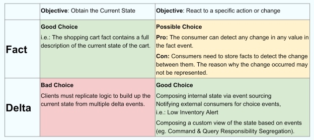 您必須考慮流的角色 - 它會(huì)提供內(nèi)部數(shù)據(jù)還是外部數(shù)據(jù)?事實(shí)是一種靈活且有彈性的模型,可用于構(gòu)建您的事件,但它們往往更大并且需要使用更多的在線數(shù)據(jù)。然而,與 delta 相比,它們完全隔離了上游系統(tǒng)的內(nèi)部邏輯,可以輕松構(gòu)建彈性解耦的消費(fèi)者來服務(wù)于特定的業(yè)務(wù)目的。