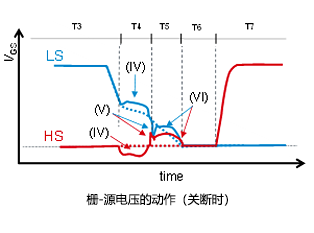 下面是雙脈沖測試中關(guān)斷時的波形、從上到下依次顯示了開關(guān)側(cè)柵極-源極電壓(VGS_HS)、非開關(guān)側(cè)柵極-源極電壓(VGS_LS)、漏極-源極電壓(VDS)和漏極電流(ID)。圖中一并列出了前述的抑制電路(a)、(b)、(c)、以及同時具備抑制電路(b)和(c)的電路(e)的波形。