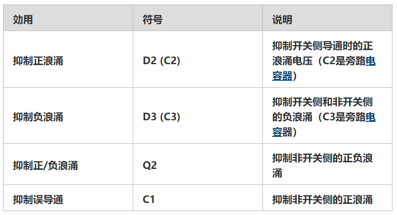 另外,下表中列出了所添加的抑制電路的功能。添加了上面電路圖中紅色標(biāo)記的部件。