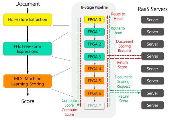 如下圖所示,每 8 塊 FPGA 穿成一條鏈,中間用前面提到的 10 Gbps 專用網(wǎng)線來通信。這 8 塊 FPGA 各司其職,有的負(fù)責(zé)從文檔中提取特征(黃色),有的負(fù)責(zé)計(jì)算特征表達(dá)式(綠色),有的負(fù)責(zé)計(jì)算文檔的得分(紅色)。
