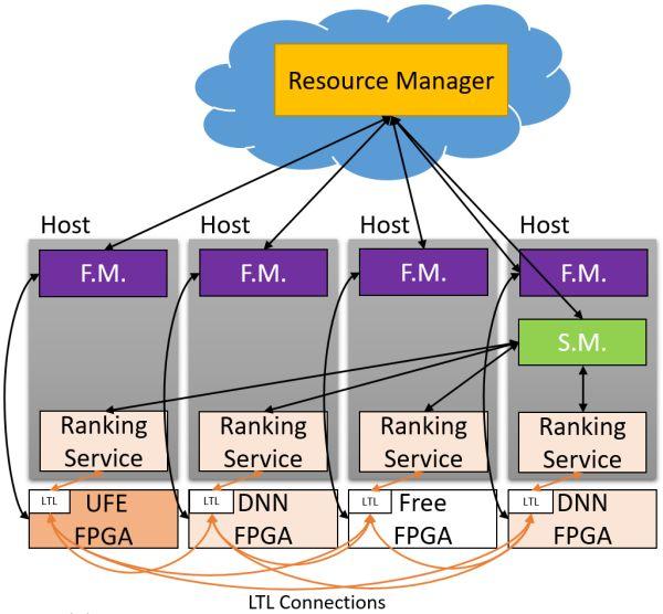 通過高帶寬、低延遲的網(wǎng)絡(luò)互聯(lián)的 FPGA 構(gòu)成了介于網(wǎng)絡(luò)交換層和傳統(tǒng)服務(wù)器軟件之間的數(shù)據(jù)中心加速平面。