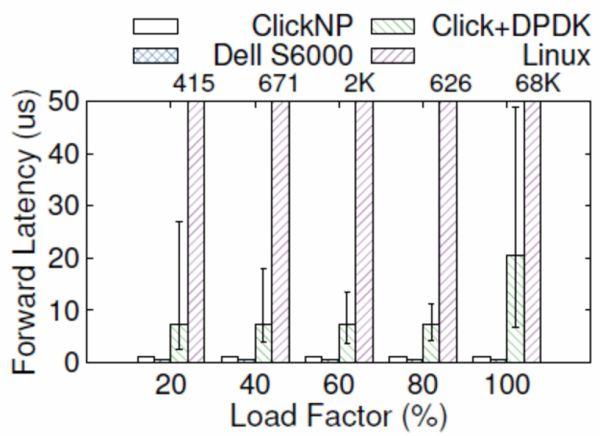 ClickNP(FPGA)與 Dell S6000 交換機(jī)(商用交換機(jī)芯片)、Click+DPDK(CPU)和 Linux(CPU)的轉(zhuǎn)發(fā)延遲比較,error bar 表示 5% 和 95%。