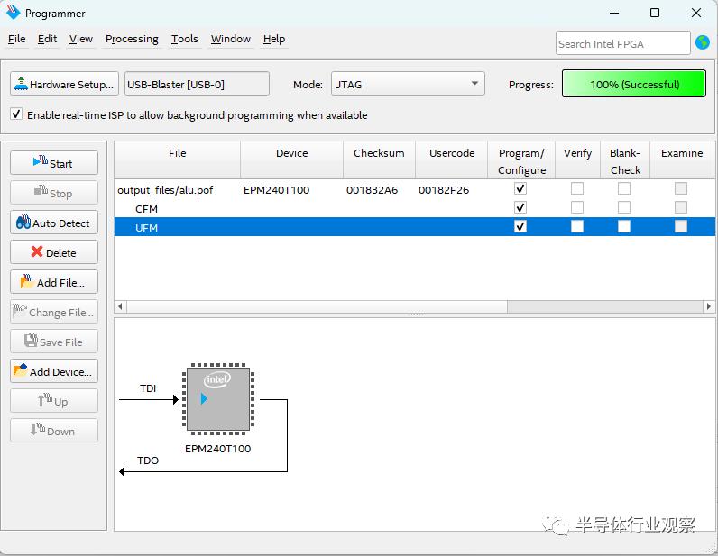 之后,我們可以通過進(jìn)入“工具->編程器”并選中“編程/配置”來運(yùn)行編程器,如圖9所示。然后我們需要打開“硬件設(shè)置”并選擇“USB Blaster”作為我們的“可用硬件” item”(我們的程序員),然后單擊“Start”將我們的代碼上傳到 Altera MAX II。